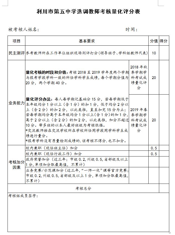 1.考核标准:《利川市第五中学选调教师考核量化评分表》